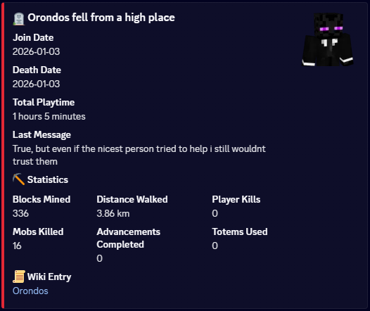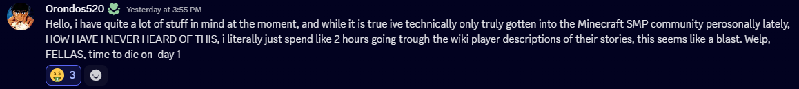 Orondo was new to Minecraft SMPs, and after stumbling onto LHC, he spent two hours researching the wiki; notably, he spent more time on the wiki than on the server. There is not much to say about this guy; however, he was very confident in his lack of skills and, of course, his lack of coffee. Although he had a solid strategy, “I have officially decided to trust absolutely no one for the time being, sorry anyone with actually good intentions”, it failed him as he trusted the one person who would lead to his death; himself.